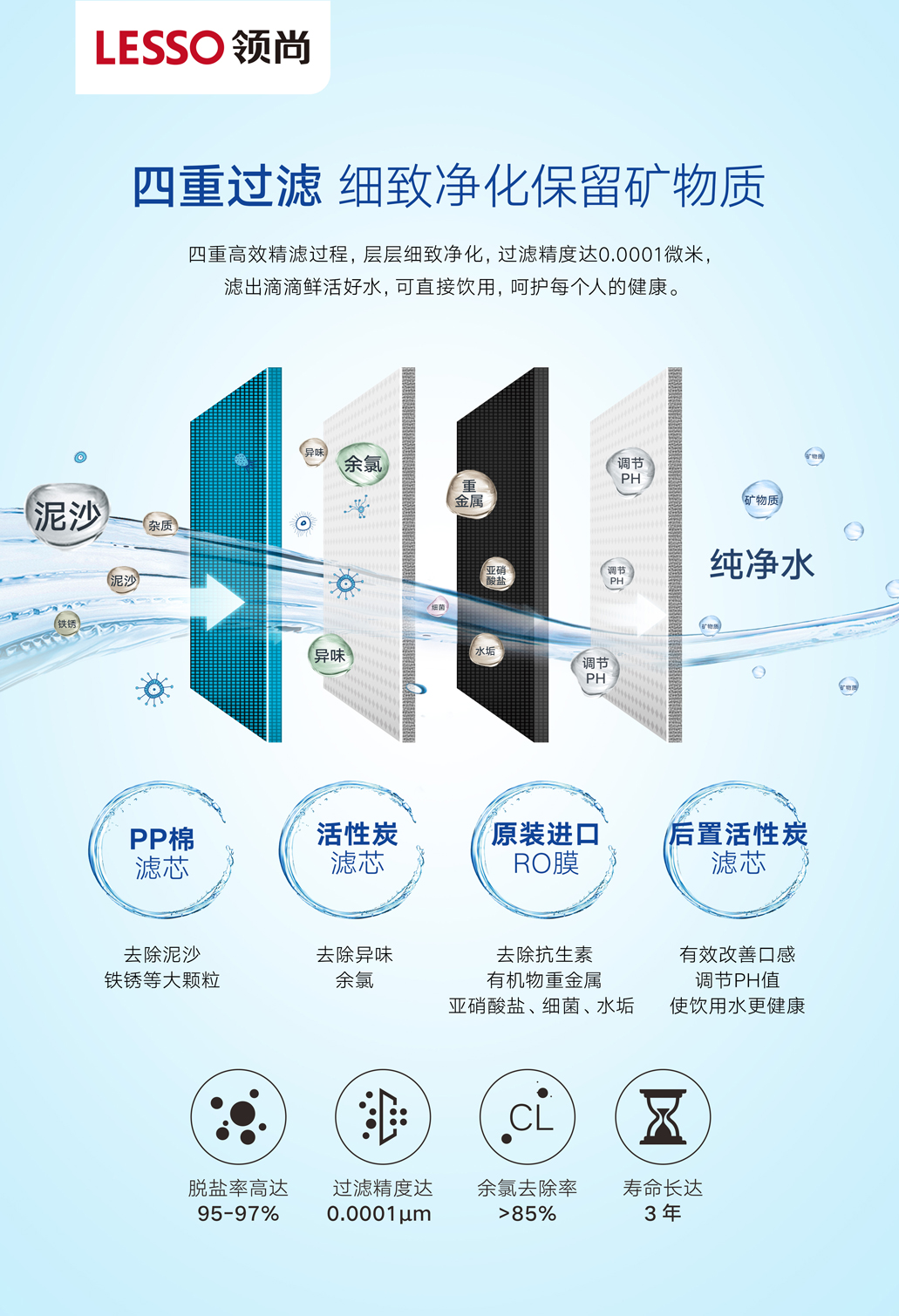 為了達到更精細的過濾效果,領尚反滲透凈水機LS314GR采用四層高效精細過濾系統(tǒng),包括:“PP棉濾芯+活性炭濾芯+原裝進口RO膜+后置礦化富鍶濾芯”,無論是水中的雜質、漂浮物,還是肉眼不可見的重金屬、農藥殘留物、化學污染物都能有效攔截,過濾出來的水可達到直接飲用的標準。