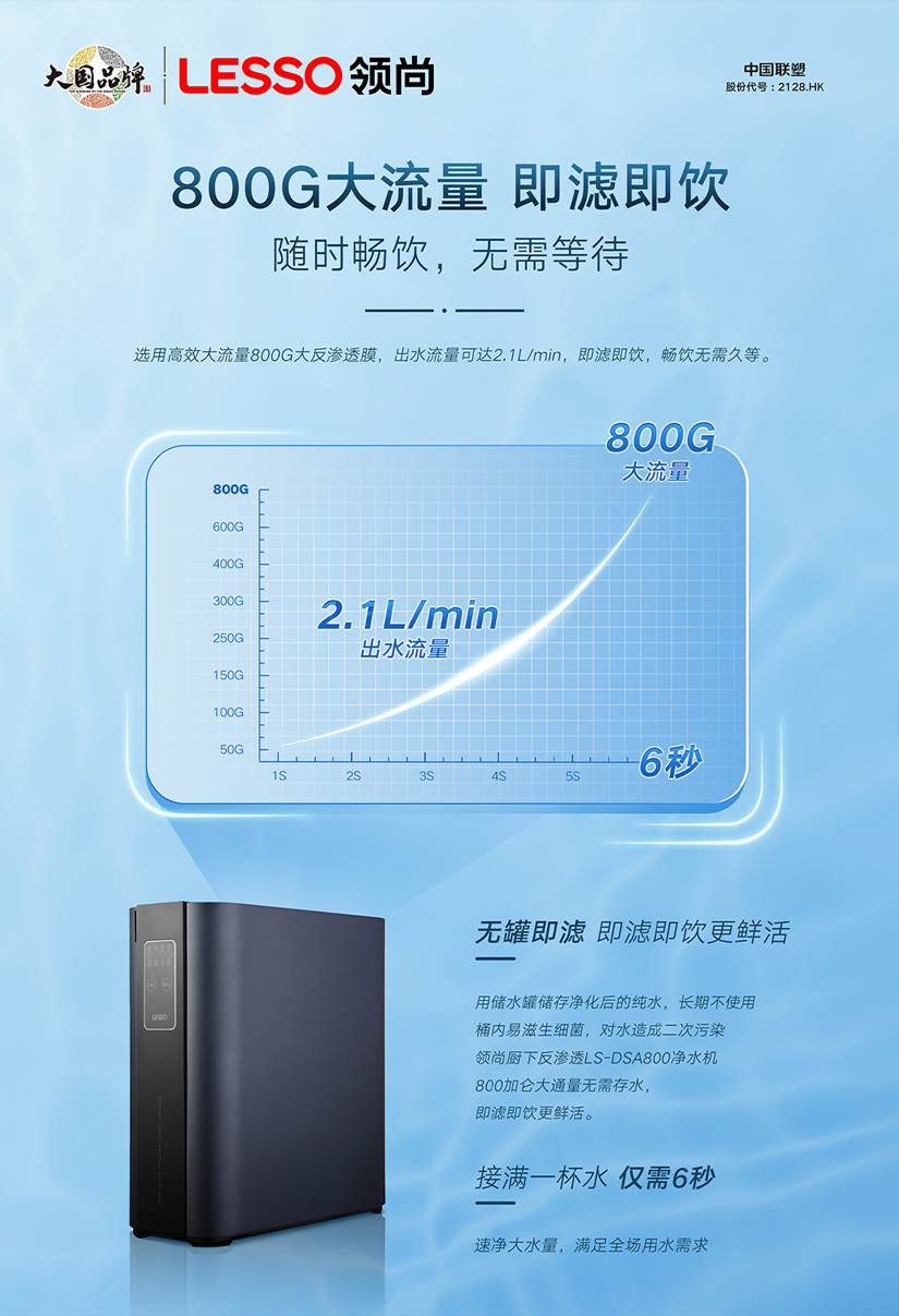 這里向大家推薦領(lǐng)尚反滲透凈水機(jī),它采用的進(jìn)口原裝RO反滲透膜能有效截留各種雜質(zhì),而且性能穩(wěn)定可靠。為了達(dá)到更精細(xì)的過濾效果,領(lǐng)尚反滲透凈水機(jī)采用“PP棉濾芯+活性炭濾芯+原裝進(jìn)口RO膜+后置礦化富鍶濾芯”四重高效精濾系統(tǒng),無論是水中的雜質(zhì)、漂浮物,還是肉眼不可見的重金屬、農(nóng)藥殘留物、化學(xué)污染物都能有效攔截,過濾出來的水可達(dá)到直接飲用的標(biāo)準(zhǔn)。而且領(lǐng)尚已經(jīng)能做到800G的大通量,出水速度非???,接滿一杯水僅需6秒,完全滿足一家人的飲水量,時(shí)刻暢飲純鮮水。