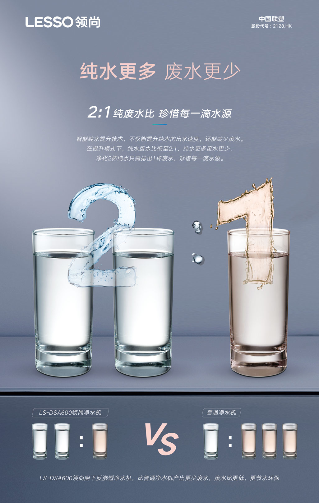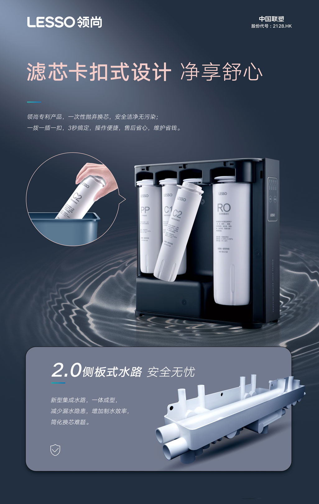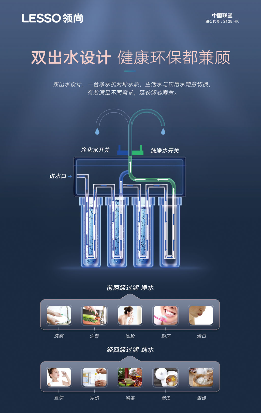 ①雙出水設(shè)計(jì),兼顧生活水與飲用水,延長(zhǎng)濾芯壽命