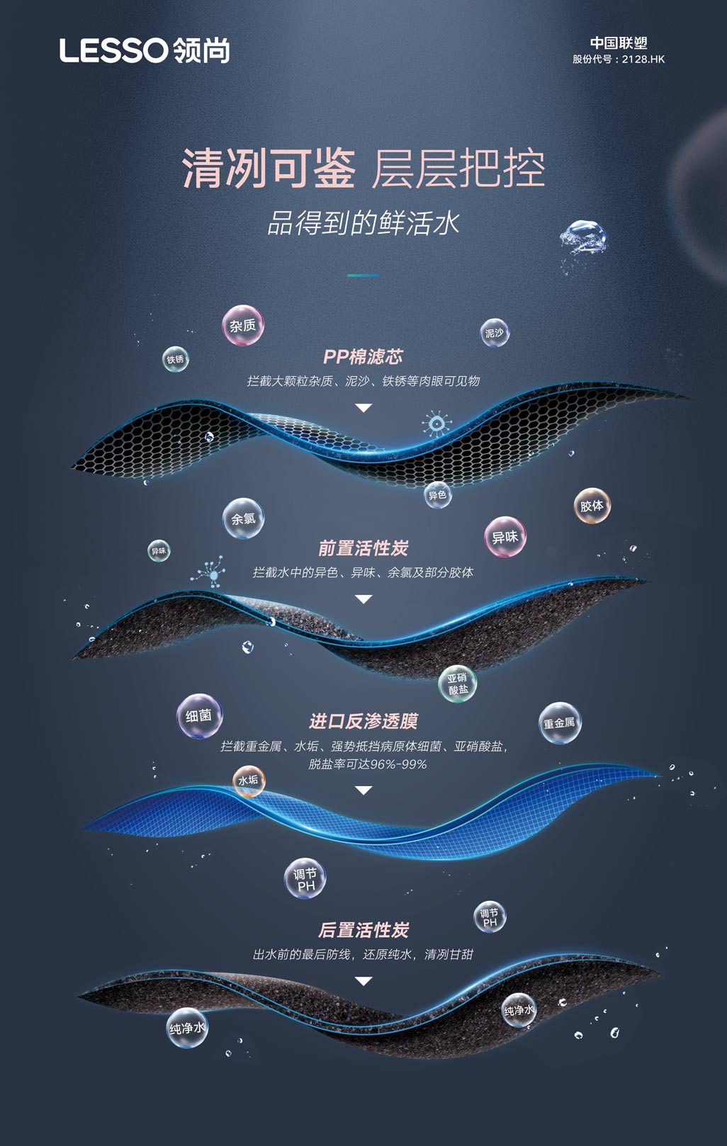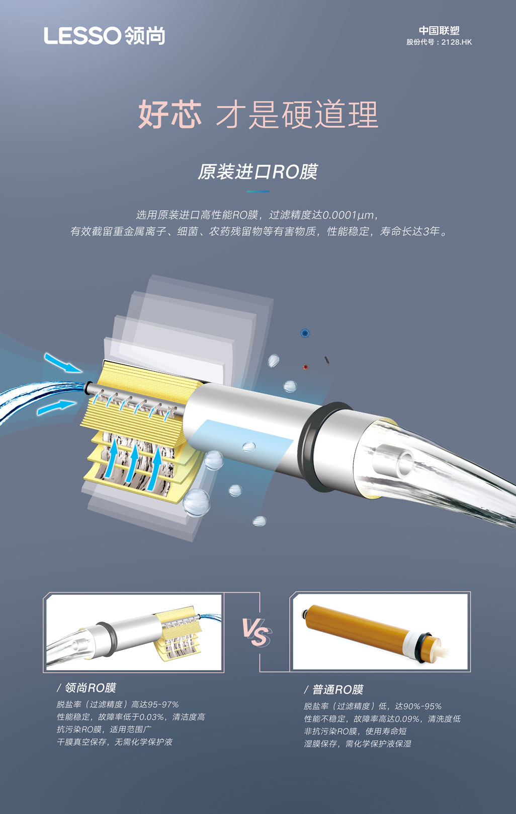 ⑤原裝進(jìn)口RO膜,過濾精度達(dá)0.0001微米,有效攔截重金屬離子、細(xì)菌等有害物質(zhì)