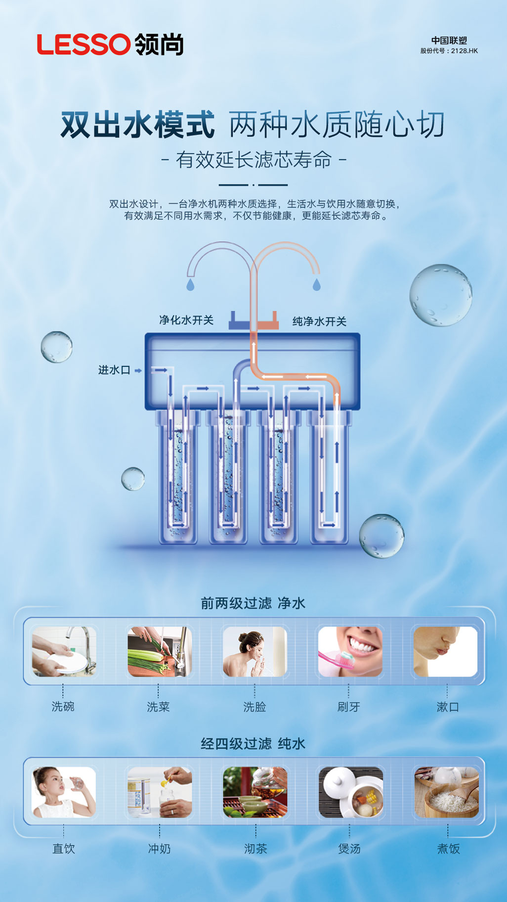 ②雙出水模式,可出純水與凈水,滿足不同用水需求