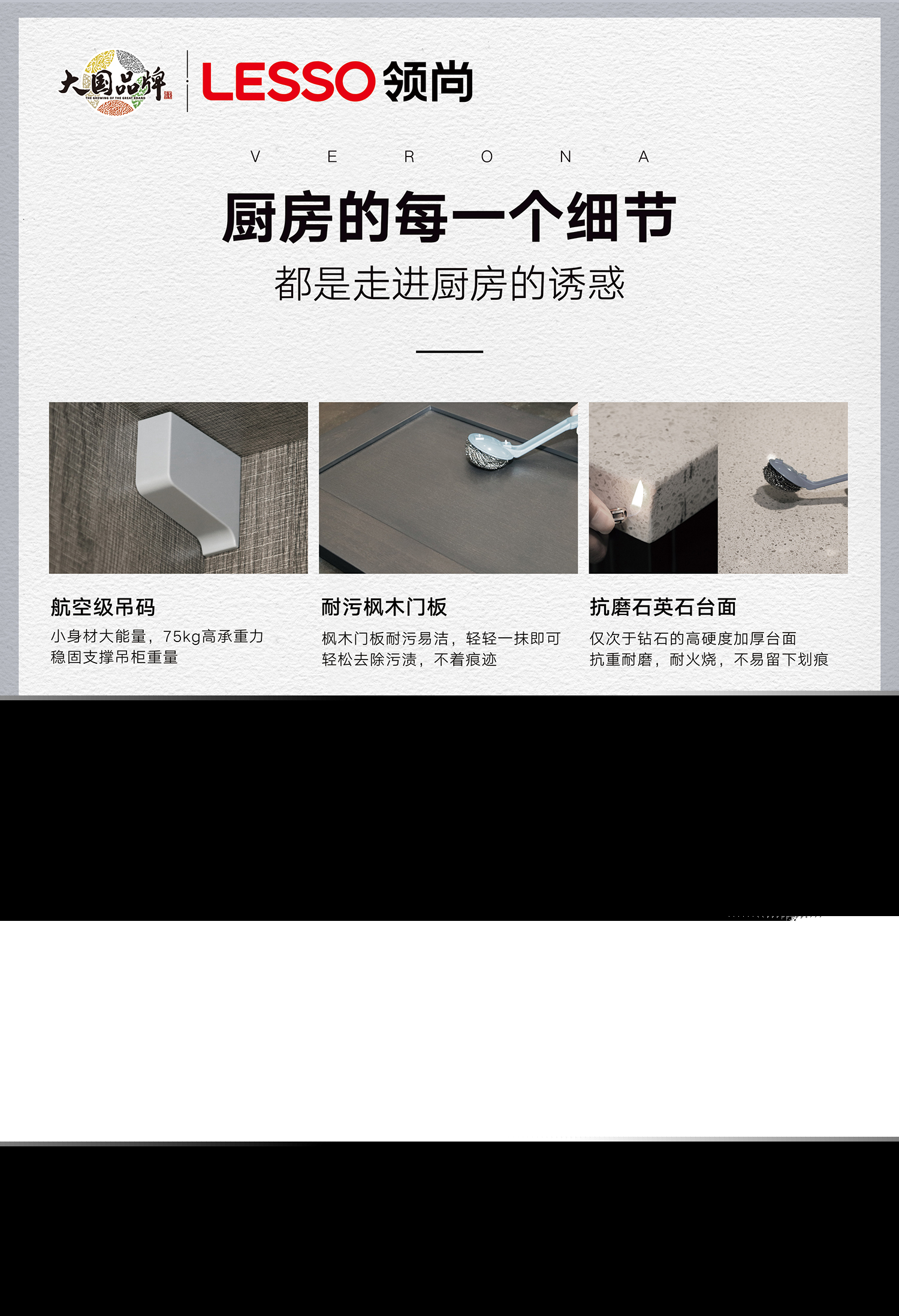 1、柜身采用規(guī)則的幾何線條設(shè)計(jì),無裝飾的大面積深灰色使得整體自顯嚴(yán)謹(jǐn)端莊,帶來低調(diào)與沉靜感;與臺(tái)面白色石英石結(jié)合,呈現(xiàn)簡約穩(wěn)重而又不失檔次的意式簡約風(fēng)格;