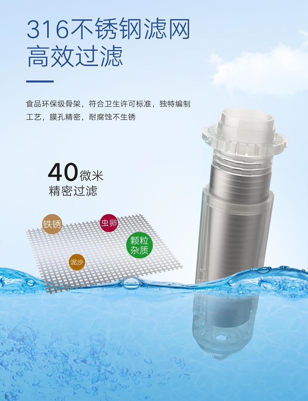 ①40微米高效精濾,食品級(jí)不銹鋼濾網(wǎng),有效阻擋紅蟲、泥沙等雜質(zhì)②虹吸式反沖技術(shù),清洗濾芯污垢,無需更換濾芯③手動(dòng)時(shí)間記憶轉(zhuǎn)盤,記憶排污周期④精密環(huán)保電鍍,歷久彌新⑤PPR熱熔接口,安裝便捷