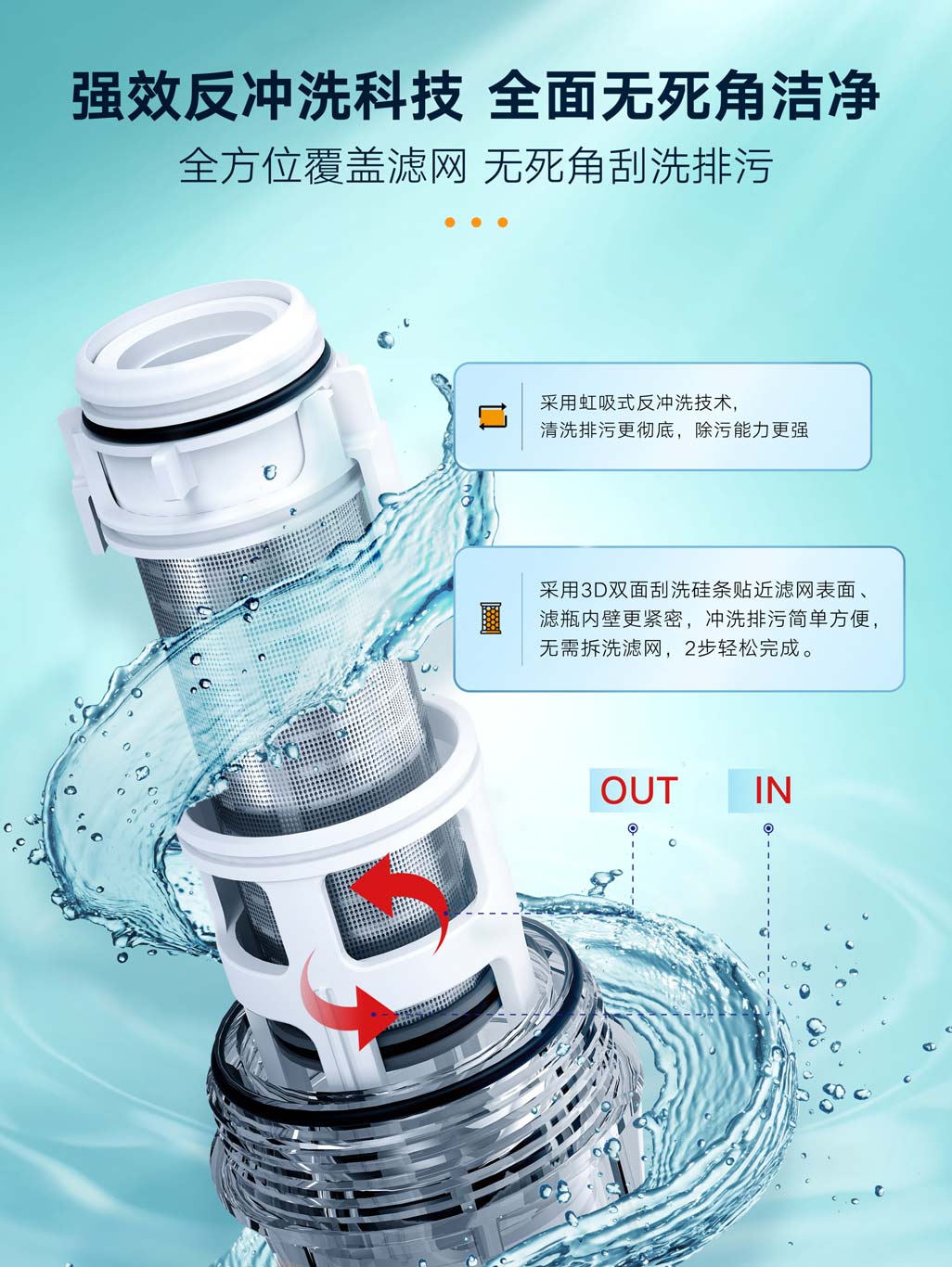 ③虹吸式反沖洗技術(shù)搭配3D雙面旋刮硅膠掛環(huán),深層有效清洗濾芯,讓濾芯壽命更長